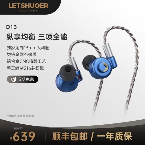 ¥639.00LETHUOER 铄耳D13是铄耳声学科技有限公司设计制造的新型动圈入耳式耳机。它配备了定制的 13 毫米 DLC 类钻石振膜动圈单元,这是我们团队的新研发成果。它是一款创新的动圈式入耳式高保真耳机 ,专为发烧友和音乐爱好者打造。 特征: ☆ 定制13mm的DLC类钻石振膜动圈单元 ☆ 标配两种不同的出音滤网,两种不同风格的听感体验